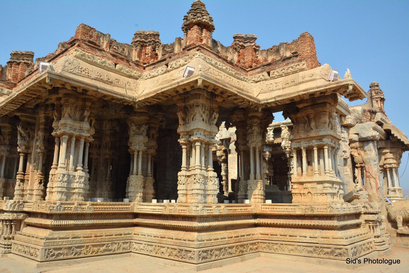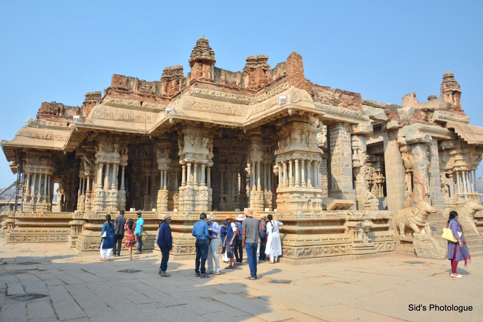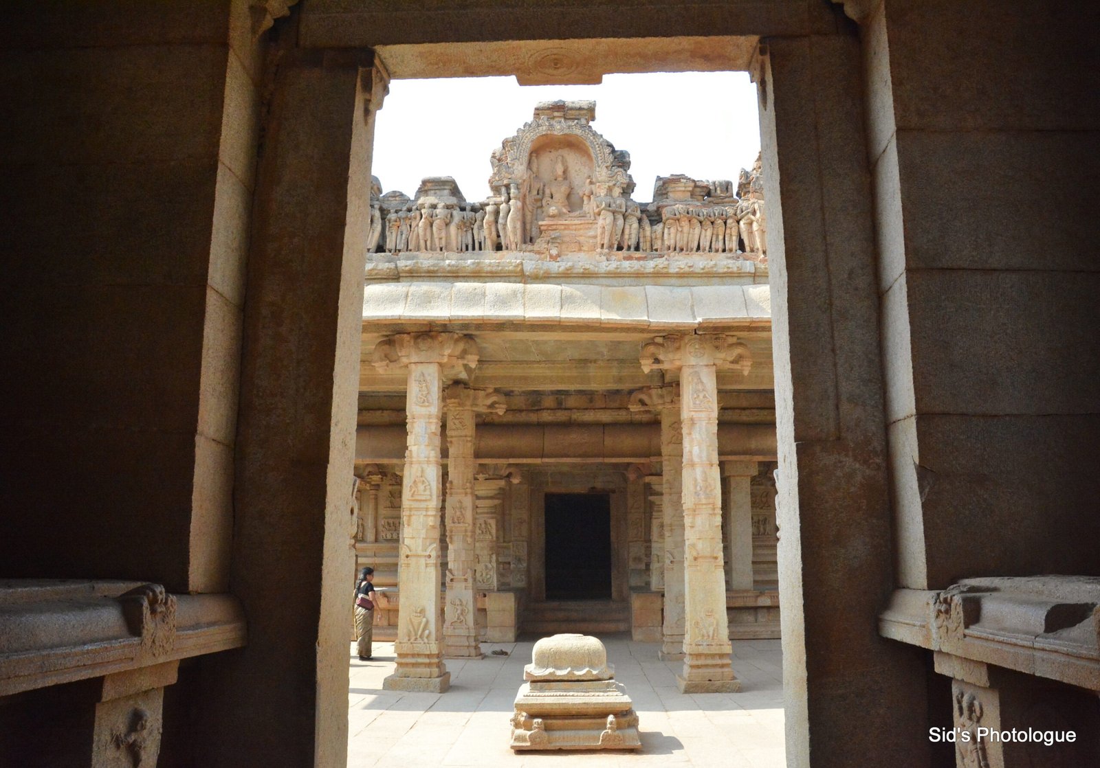 In the front of the stone chariot is a large, square, open-pillared, axial sabha mandapa, or the community hall. This Mandap is believed to have a wooden roof, which was either destroyed by the invaders or was lost in natural calamities.