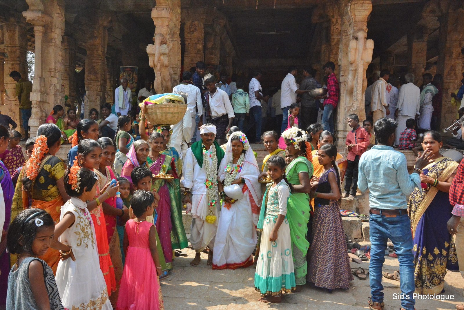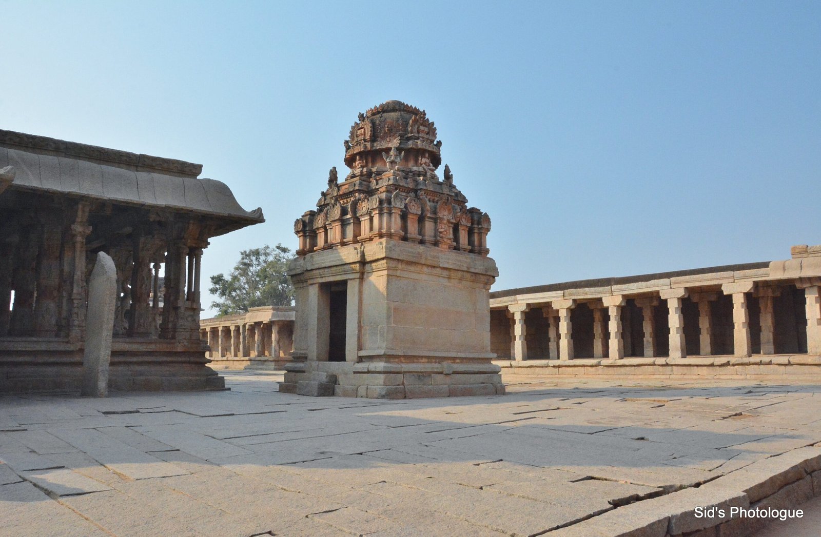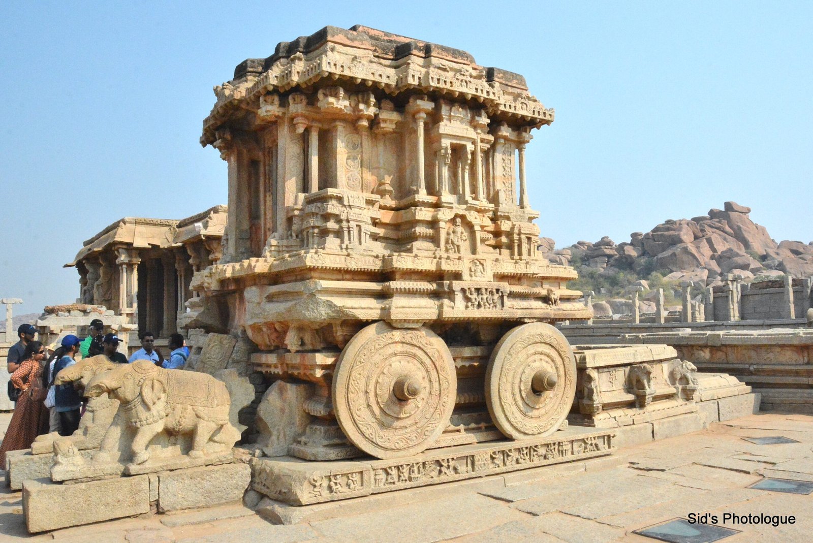 In the front of the stone chariot is a large, square, open-pillared, axial sabha mandapa, or the community hall. This Mandap is believed to have a wooden roof, which was either destroyed by the invaders or was lost in natural calamities.