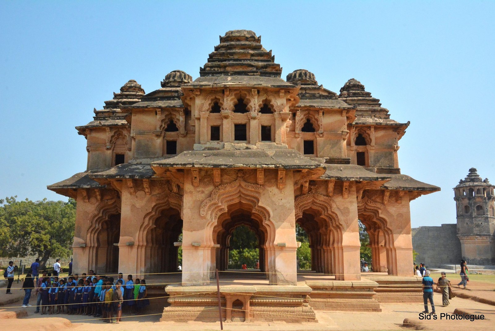 The Zenana enclosure contains the Lotus Mahal, a two-storeyed pavilion that combines a symmetrical, square, Hindu mandala design with lobed arches, vaults and domes of the Indo-Islamic style