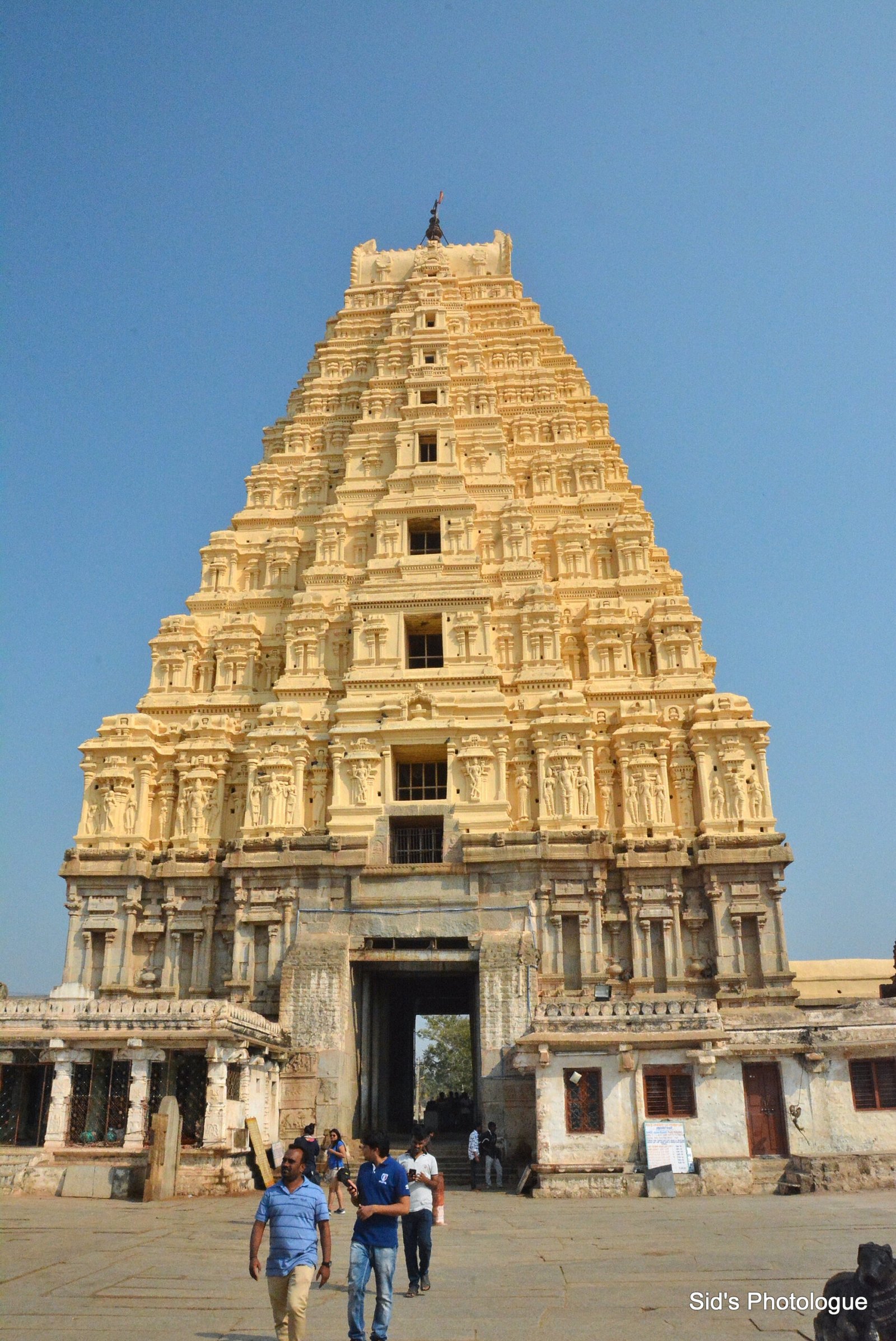 The Virupaksha temple is the oldest shrine, the principal destination for pilgrims and tourists, and remains an active Hindu worship site. It is believed to be dated as old as 7th century. The temple faces eastwards, aligning the sanctums of the Shiva and Pampa Devi temples to the sunrise; a large gopuram marks its entrance. The superstructure is a pyramidal tower with pilastered storeys on each of which is artwork including erotic sculptures…..
