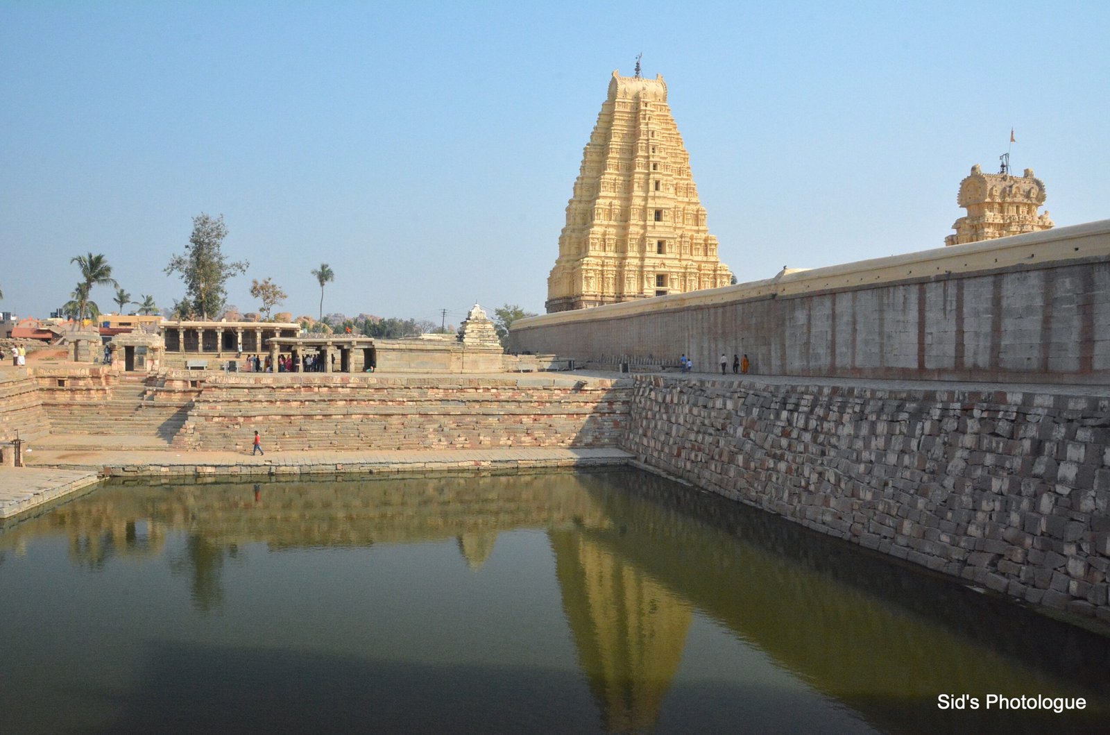The Vitthala temple and market complex spread over 2 sq km, are near the banks of the Tungabhadra River. In a very typical architectural layout, the road leading to the main temple has water storage arrangements in the form of stepped pond – called Pushkarini.