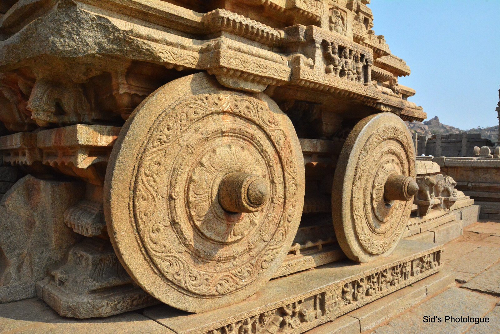 The courtyard’s ornate stone chariot (illustrated on the new ₹50 note) is the temple’s showpiece and represents Vishnu’s vehicle with an image of Garuda within. This Garuda shrine in the form of a stone chariot is also a pictured symbol of Hampi. The wheels of this towered shrine were once capable of moving. Also the elephants in the front were not the original animals. The chariot was originally pulled by horses, which were damaged & were replaced by elephants.